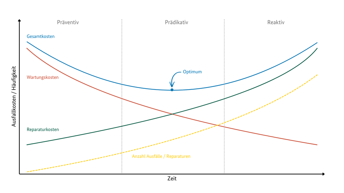 | Wie die obenstehende Grafik verdeutlicht, steigen mit längeren Intervallen die Wahrscheinlichkeit und Häufigkeit von Ausfällen (gelbe Linie) und damit die Reparaturkosten (grüne Linie). Je später eingegriffen wird, desto größer sind mögliche Folgeschäden, denn es können weitere Bauteile in Mitleidenschaft geraten. Bei präventivem Vorgehen sind die Wartungskosten (orangene Linie) höher, da regelmäßig Maßnahmen zum Erhalt des Sollzustands anfallen. Die Gesamtkosten als Summe aus Wartungskosten und Reparaturkosten verlaufen U-förmig und haben ein Minimum (blaue Linie). Ziel der Erhaltungsstrategie ist, diesen optimalen Wartungszeitpunkt zu treffen. |