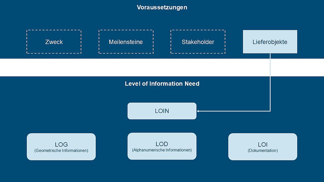LOIN steht für Level of Information Need, also die Informationsbedarfstiefe, die bei der modellbasierten Planung, Ausführung und Bewirtschaftung von Bauwerken benötigt wird. Darin enthalten sind die Art, der Umfang und die Qualität der Informationen, die für ein bestimmtes Bauobjekt zu einem bestimmten Zeitpunkt und für einen bestimmten Zwecke erforderlich sind. Dies umfasst sowohl geometrische und alphanumerische Informationen (z. B. Material, Kosten, Termine) als auch dokumentarische Informationen (z. B. Prüfberichte oder Nachweise).