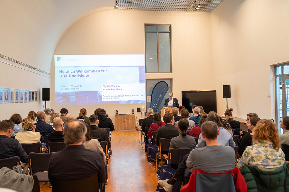 Am 24. Februar 2026 gastierte die BIM-Roadshow in Dresden. Organisiert von der Geschäftsstelle BIM Bundesbau gemeinsam mit dem Sächsischen Staatsministerium der Finanzen, bot die Veranstaltung rund 50 Teilnehmenden aus den Bauverwaltungen in Sachsen eine Plattform für fundierte Einblicke, lebendige Diskussionen und innovative Ansätze rund um Building Information Modeling.